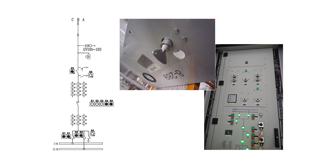 斷開(kāi)斷路器后,斷開(kāi)I母、II母隔離刀閘,再斷開(kāi)出線隔離刀閘,旋轉(zhuǎn)以上三個(gè)刀閘上的機(jī)械聯(lián)鎖鑰匙E1、E2、E3,將刀閘鎖定在斷開(kāi)狀態(tài),取出三把鑰匙插入鑰匙交換盒,交換出二把鑰匙E4、E5,用E4、E5給斷路器上下兩側(cè)接地刀閘解鎖后方可接地。